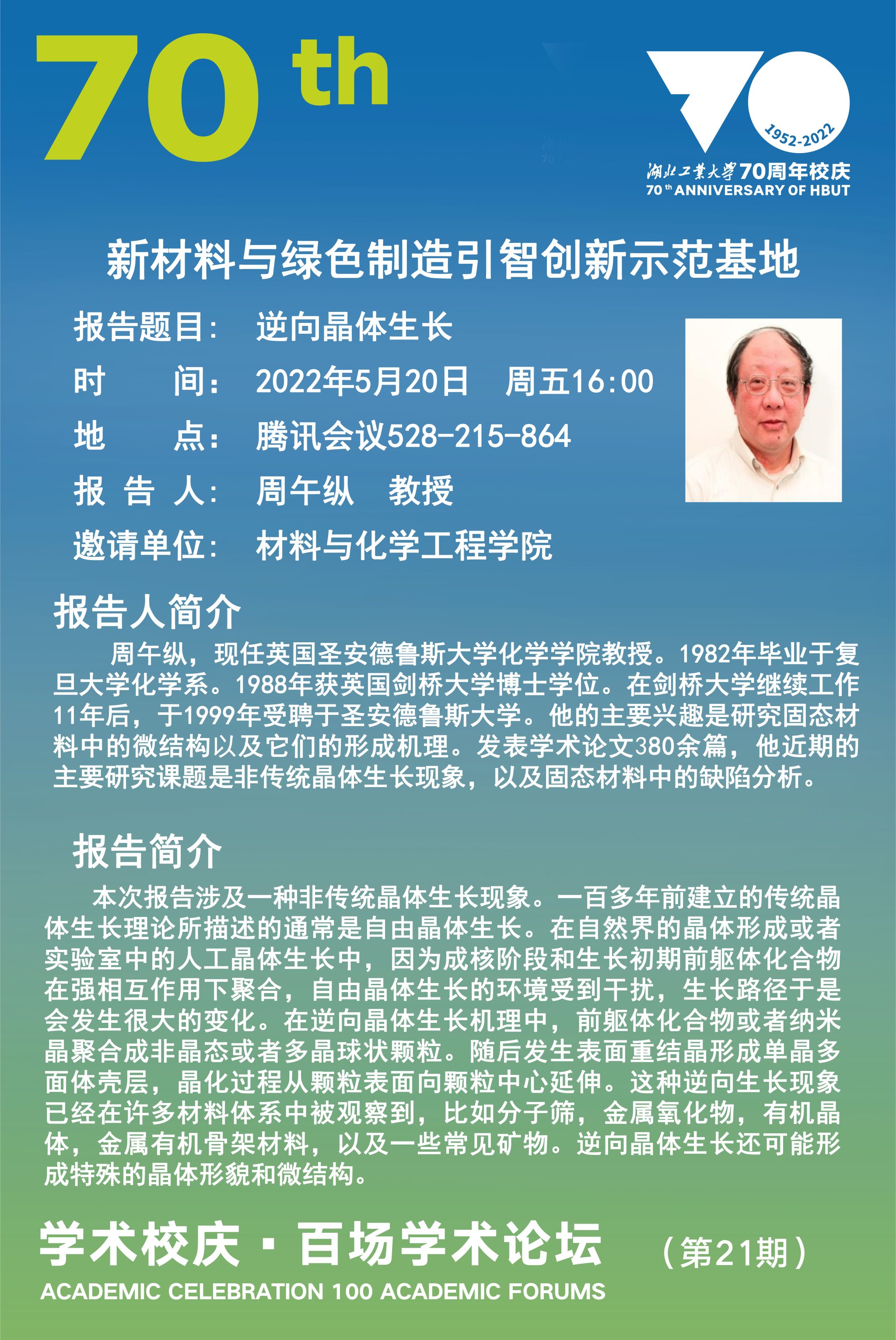 学术校庆·百场学术论坛--新材料与绿色制造引智创新示范基地学术讲座(第12期 )